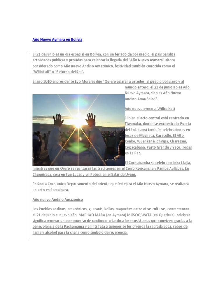 Cada 21 de junio, desde muy temprano, cuando el alba est clareando y aun no ha brillado el primer rayo de sol, un grupo de amautas (especie de sacerdotes) se rene con sus bolivia es conocida por ser el pas ms autntico de amrica latina, porque el 60% de su poblacin es de origen indgena.